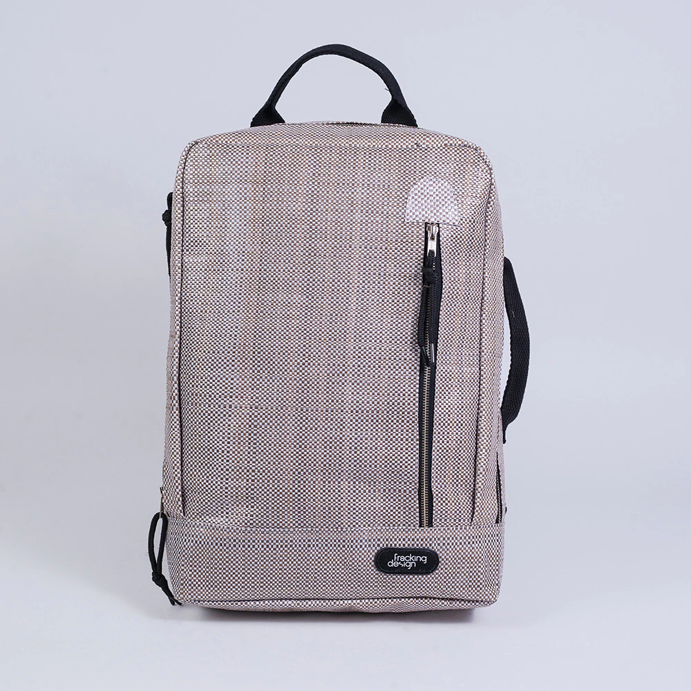 - Mochila confeccionada con Big Bags Plásticas Recicladas provenientes de Vaca Muerta, Patagonia Argentina. Combinada con detalles de tira cierres y logo en cuero vacuno de descartes,